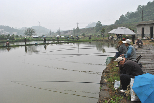 8时25分,载着钓鱼爱好者的客车在偏僻乡村鱼塘附近刚停稳,大家提着渔具赶紧依次下车,只见四个鱼塘一字排开,镶嵌在绿油油的农田和大树掩映村庄之间,远处是层次分明连绵不断的小山,既有鸡犬相闻、阡陌交通的乡村感受,又有满目苍翠,鸟鸣山幽的野逸情趣,虽然下着小雨,大家兴致很高,迅速选好点,打窝子下钩,享受农村钓鱼的快乐。当第一条草鱼被钓上时,大家投以羡慕的眼光,当一位老同志的鱼竿被大鱼拉断时,很多同志都感到惋惜……老年钓鱼协会是一个和谐的集体,真是退而求其乐,老有所乐。时间过得好快,中午草率吃了一顿盒饭,很快就到了我们返回的预定时间——下午3时,大家依依不舍的乘车返回。
