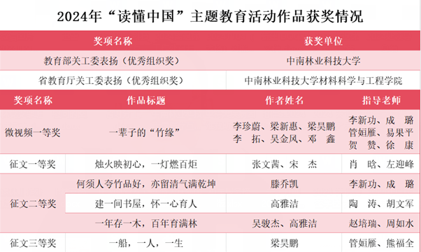 近日,中共湖南省委教育工委公布了2024年“读懂中国”主题教育活动评选结果。我校选送的微视频作品荣获湖南省一等奖并被选送至教育部,征文作品获得湖南省一等奖1项、二等奖3项、三等奖1项,学校获得教育部关工委表扬并获评活动“优秀组织奖”,材料科学与工程学院获省教育厅关工委表扬和省级“优秀组织奖”。
