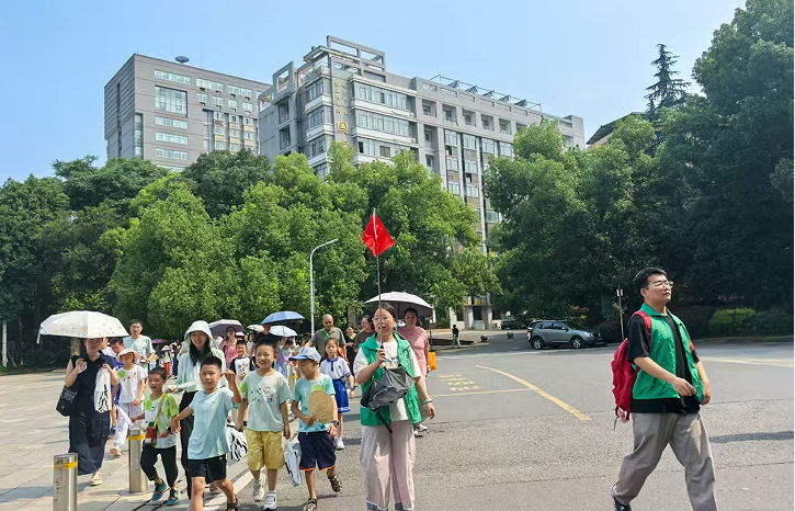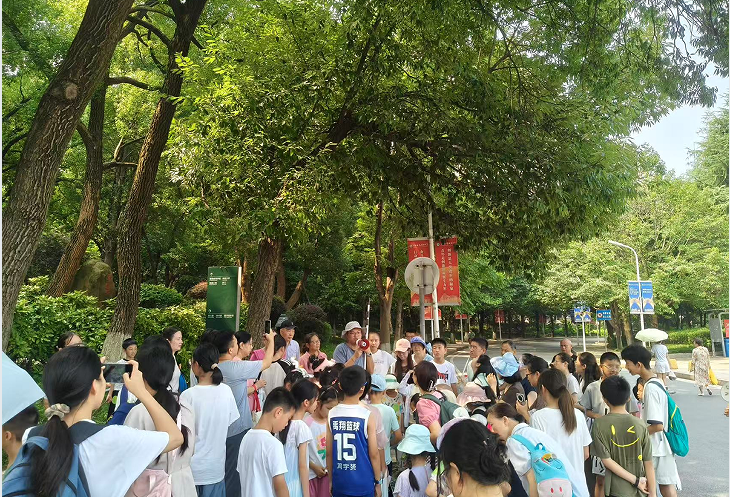 本活动邀请学校退休教师、植物分类学专家喻勋林教授为孩子们授课。喻勋林教授借助丰富的图文资料和互动问答,详细讲解各类型植被特征和常见植物的识别要点。他风趣幽默的讲解风格,激发了孩子们对大自然的好奇心和探索欲。随后,在学校关工委工作人员和大学生志愿者的引导下,孩子们分组前往校园内的高大乔木园、青青常绿园和缤纷灌木园进行实地观察。